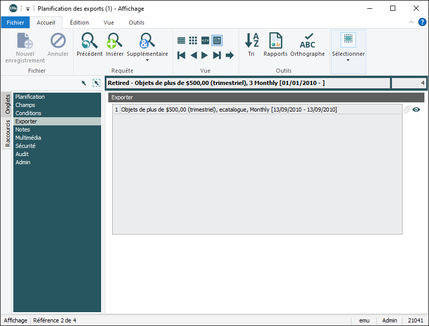 Un audit de tous les Exports planifiés est exécuté, permettant aux utilisateurs autorisés de rechercher / voir tous les exports effectués par tous les utilisateurs.