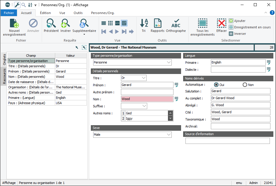 Dans cet exemple, la Liste des raccourcis comprend des champs des onglets Personne, Organisation et Biographie. Lorsque vous vous déplacez dans un ensemble d'enregistrements, la colonne Valeur de la Liste des raccourcis est mise à jour avec les valeurs de l'enregistrement en cours.