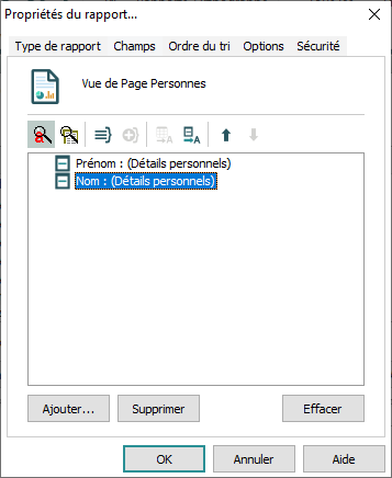 Note: Si vous sélectionnez un champ qui est une table imbriquée, Autres noms : (Détails personnels) par exemple, il est nécessaire d'inclure une simple boucle lors de la configuration du Style de Page à l'étape 2. Un champ d'une table imbriquée s'affiche dans la boîte Propriétés du rapport avec l'icône suivant Icône de table. Nous traiterons ce cas ici.