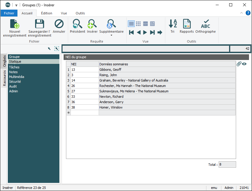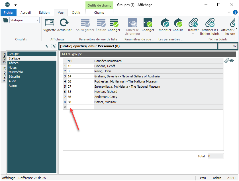 Dans le module Groupes, les enregistrements d'un groupe Statique sont répertoriés dans l'onglet Statique : les informations comprennent le NEI et les Données sommairesFermé Chaque enregistrement a un champ Données sommaires. Données sommaires est une combinaison de données importantes dans un enregistrement (tiré d'un ou plusieurs champs). En Vue de Détails, le Données sommaires de l'enregistrement en cours s'affiche sous le ruban. Le Données sommaires de l'enregistrement cible apparaissent dans un champ fichier joint lorsque deux enregistrements sont joints. Le champ ou la combinaison de champs utilisés pour constituer les Données sommaires d'un module peuvent être spécifiés par chaque institution (et implémentés par les développeurs d'Axiell). de chaque enregistrement. Le nombre d’enregistrements du groupe est également affiché :