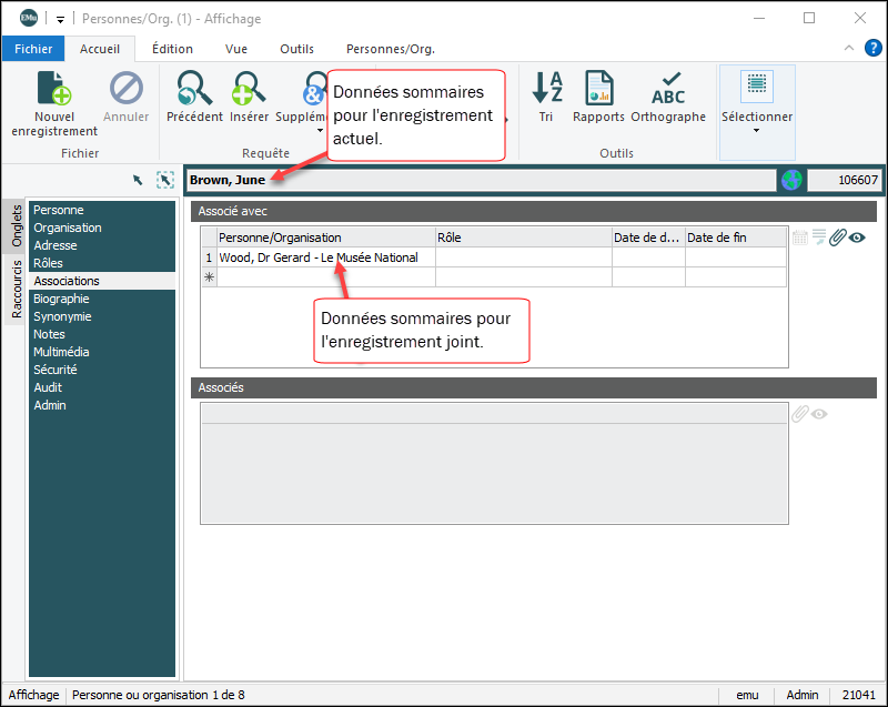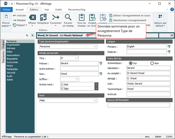 - Chaque module d'EMu possède un champ Données sommaires, un résumé d'une ligne de l'enregistrement qui s'affiche sous le ruban.