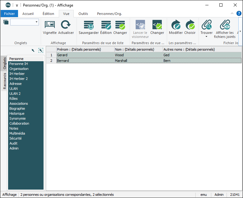 Nous avons sélectionné une Vue de Liste qui inclut le champ Autres noms : (Détails personnels) et nous avons copié les enregistrements :