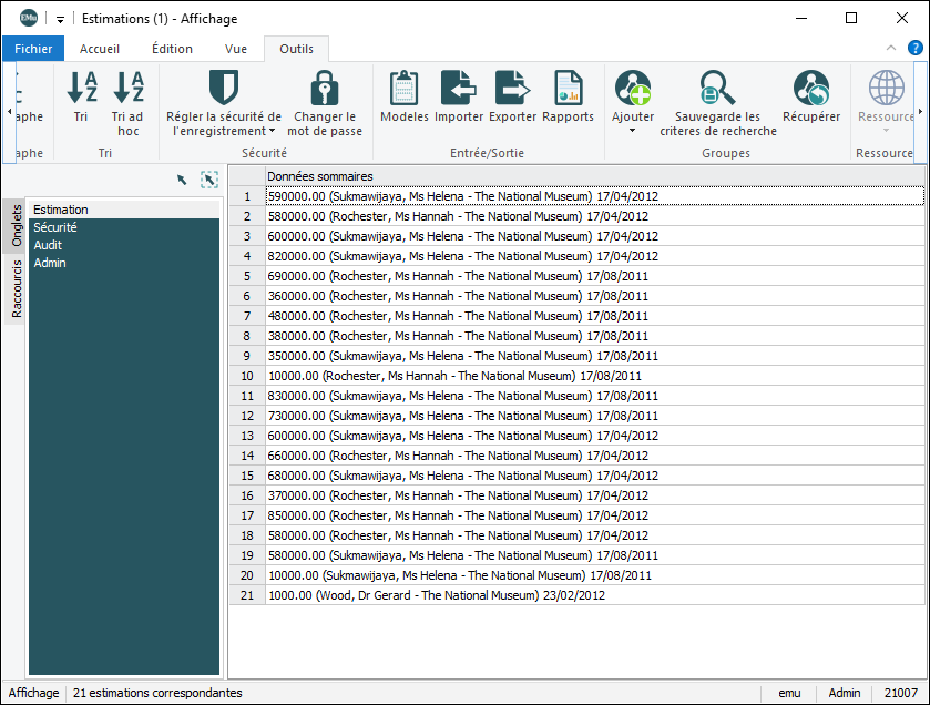 Avant que nous abordions la création de rapports en utilisant Crystal Reports, nous allons voir trois façons assez simple de transférer vos données d’EMu à Microsoft Excel où elles peuvent être manipulées de différentes manières pour produire des rapports sophistiqués assez rapidement.