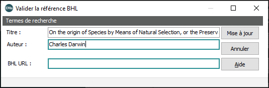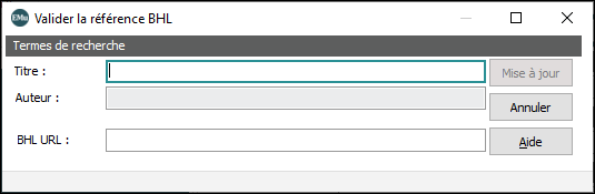 La boîte de dialogue Valider la référence BHL s’affiche et le champ Titre se remplit automatiquement avec le titre de l’enregistrement en cours :