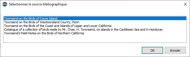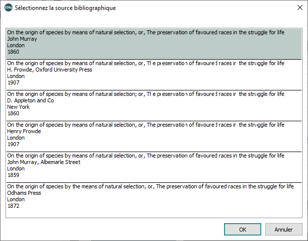 Dans les deux cas, sélectionnez un titre dans la liste pour alimenter l’enregistrement actuel avec les données de BHL.