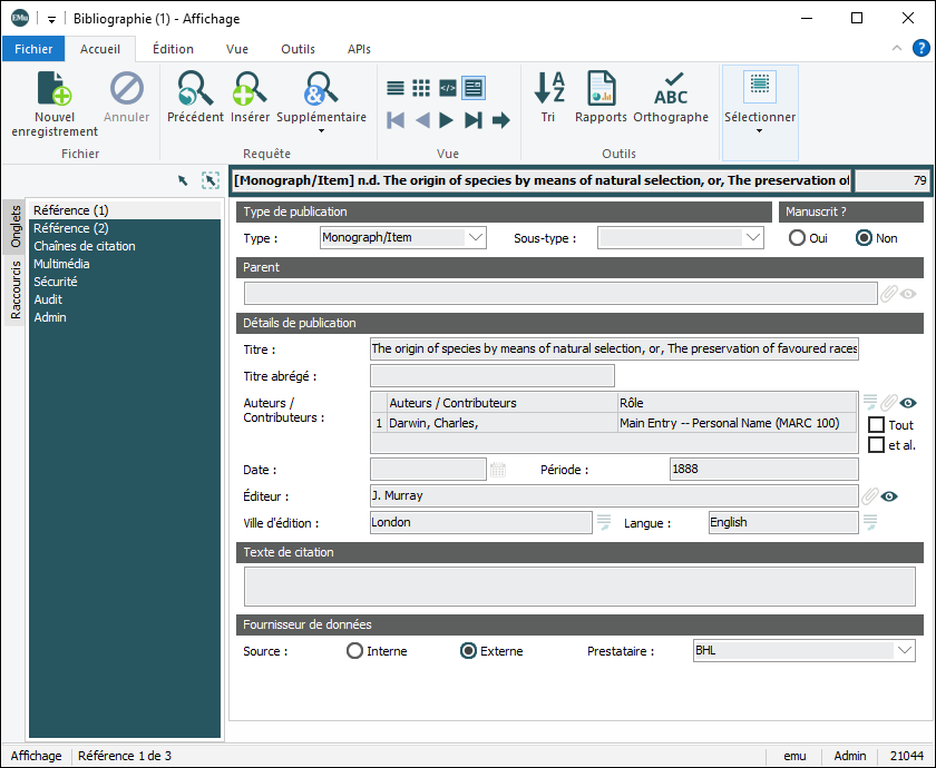 Également appelée Liste de sélection ou Liste d'autorités, une Liste de consultation est une liste des valeurs qui ont été utilisées ou dont l'utilisation est suggérée dans un champ. Plutôt que d'entrer une valeur dans le champ, il est possible de choisir une valeur dans la liste de recherche ; la valeur sélectionnée remplira le champ..Les données BHL rempliront les onglets Référence (1), Référence (2) et Chaînes de citation, qui deviendront en lecture seule et l’enregistrement sera automatiquement sauvegardé :
