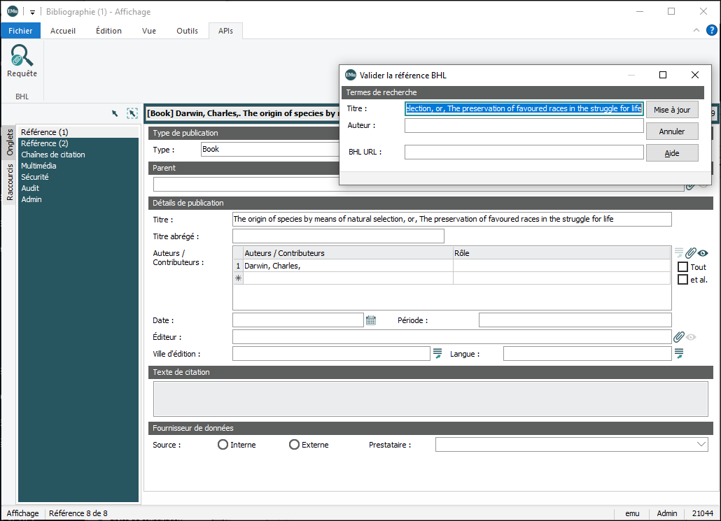 Lorsqu’une institution adopte l’un des nouveaux modèles de bibliographie proposés par EMu 8, il est possible d’alimenter les notices avec des informations bibliographiques provenant directement de la Biodiversity Heritage Library (BHL) :