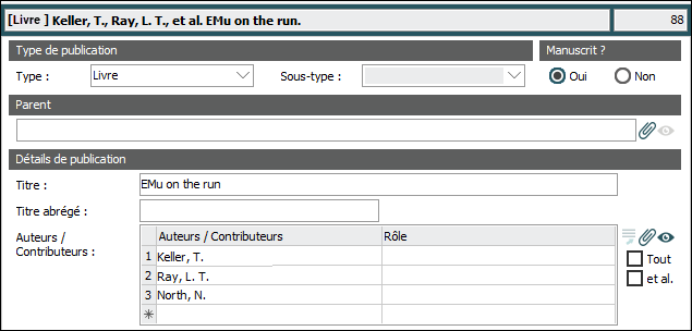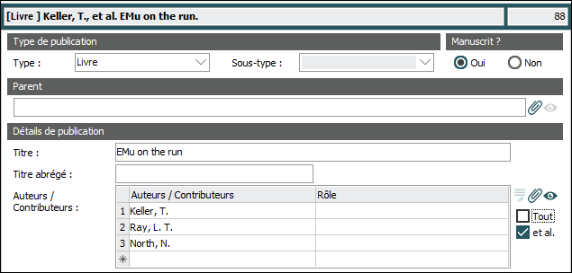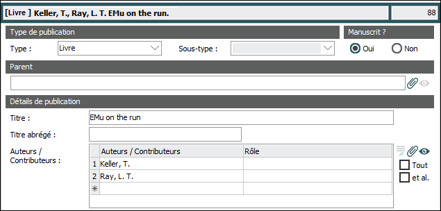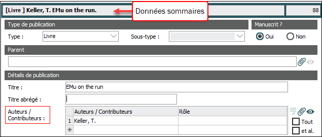 Par défaut, les auteurs / contributeurs figurant dans le tableau Auteurs / Contributeurs sont inclus dans Données sommaires
