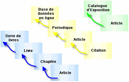 Le diagramme suivant illustre plusieurs exemples de hiérarchies pouvant être créées entre les enregistrements de Bibliographie :