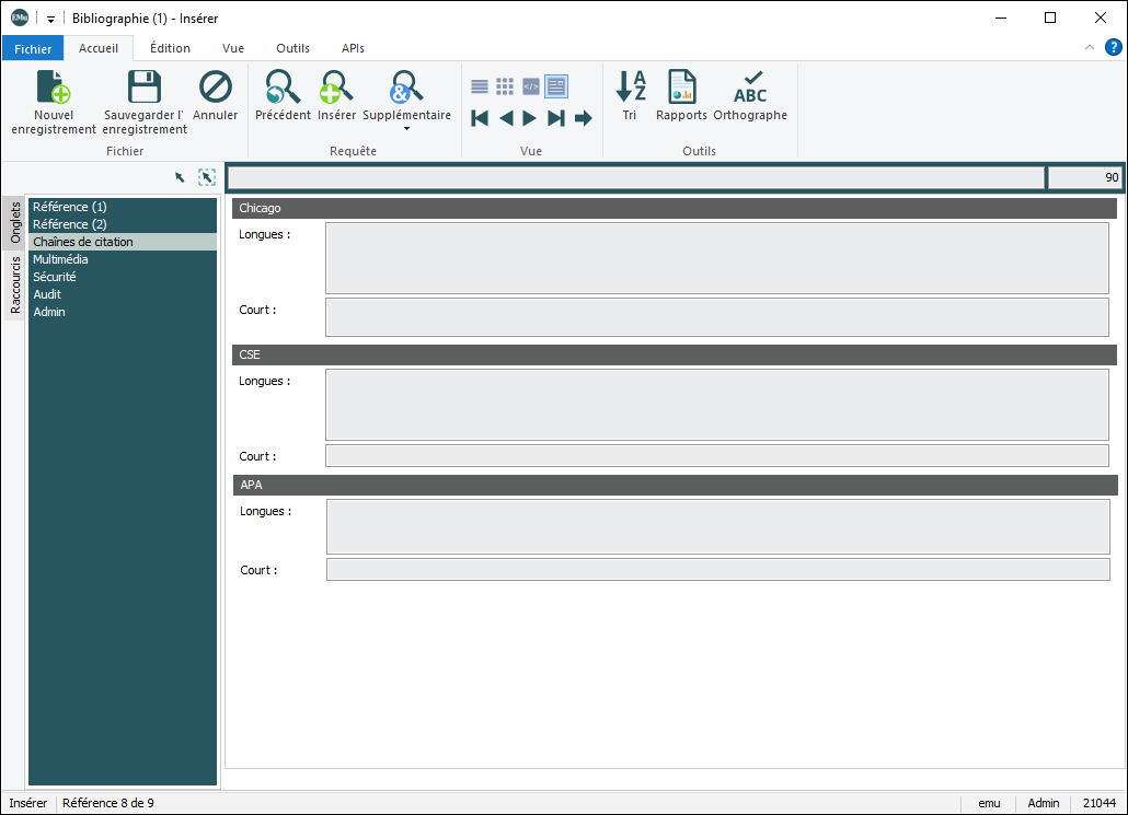 Également appelée Liste de sélection ou Liste d'autorités, une Liste de consultation est une liste des valeurs qui ont été utilisées ou dont l'utilisation est suggérée dans un champ. Plutôt que d'entrer une valeur dans le champ, il est possible de choisir une valeur dans la liste de recherche ; la valeur sélectionnée remplira le champ..Les données BHL rempliront les onglets Référence (1), Référence (2) et Chaînes de citation :