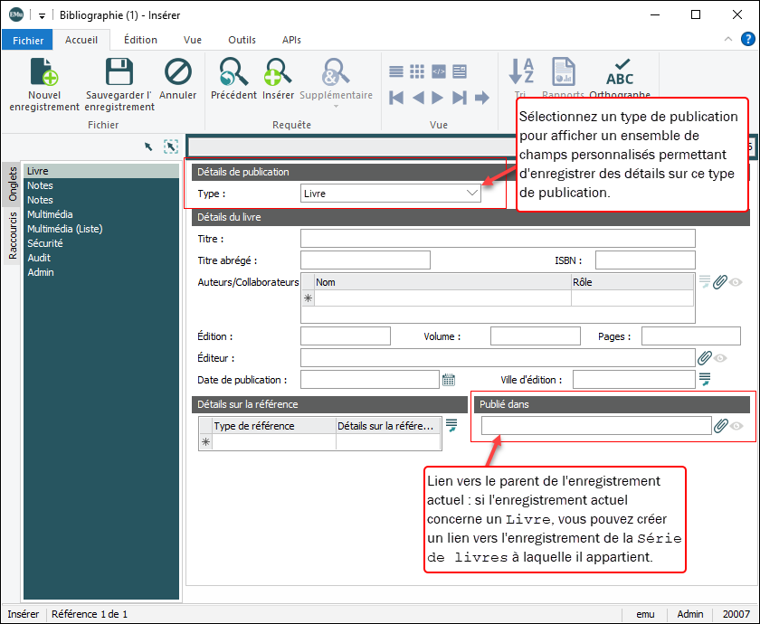 Avant EMu 8.0, une seule version du module Bibliographie était disponible. Lors de l’enregistrement des détails d’un type de publication (livre, article, électronique, série, catalogue, chapitre, citation, etc.), la sélection d’une option dans la liste déroulante Type : (Détails de la publication) affiche un onglet avec un ensemble de champs adaptés. Nous voyons ici l’onglet et les champs pour un livre : Une hiérarchie d’enregistrements bibliographiques peut être établie en joignant l’enregistrement en cours |