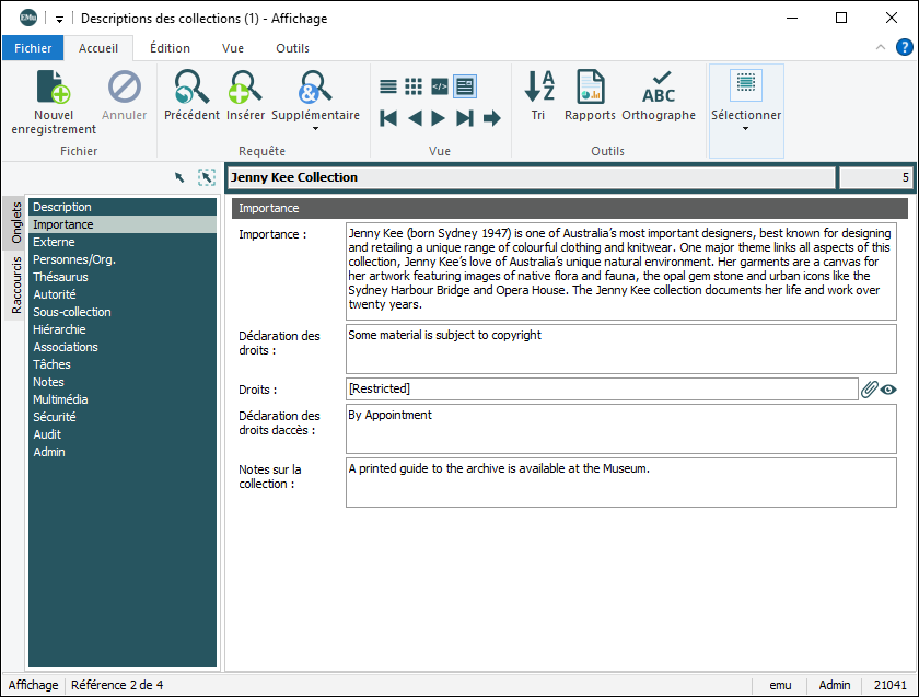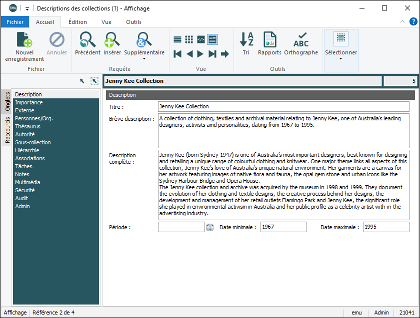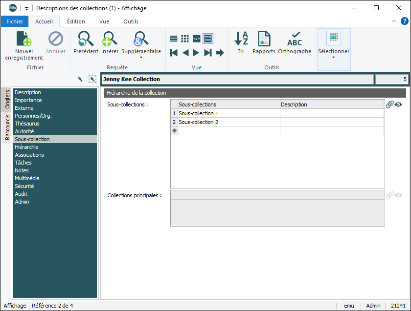 Le module Descriptions des collections contient les détails descriptifs de haut niveau sur les collections Une collection est, de façon très large, n'importe quel groupe d'items ayant un lien. La relation peut être des items collectés lors d'une expédition scientifique, des peintures d'une période donnée ou par un artiste spécifique, et ainsi de suite.