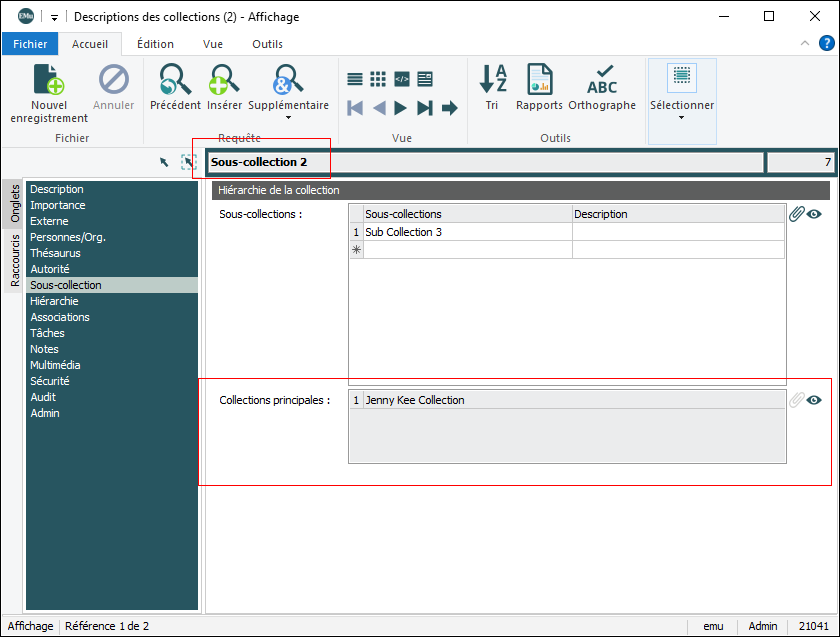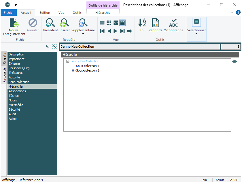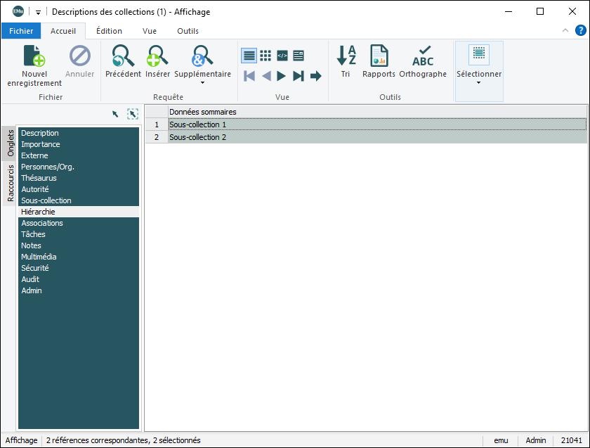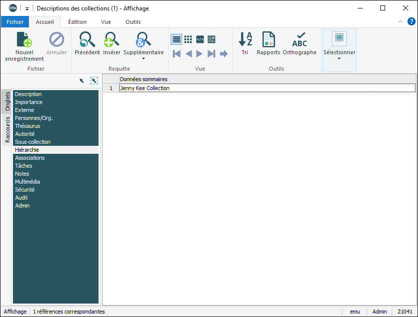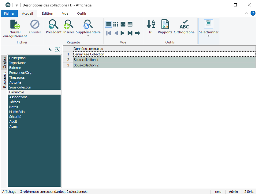 Les détails au niveau de la collection sont enregistrés dans neuf onglets :
