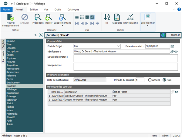 Les constats d’état sont généralement effectués lorsqu’un objet arrive ou part d’une institution. Un constat d'état est relativement superficiel et peut être effectué par n'importe quel employé pour déterminer l'état général d'un objet. Après la réalisation d'un constat d'état, les détails de l'état de l'objet sont enregistrés dans l'onglet Condition du module Catalogue ; ces détails sont automatiquement enregistrés dans le module Constats d'état.