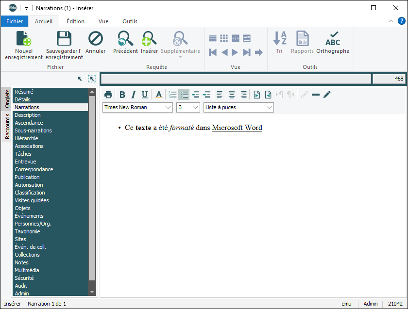 Note: Les Narrations sont idéales pour une utilisation dans des présentations web / présentations de collection en ligne. Le texte peut être formaté ou corrigé dans le module Narration, prêt pour son affichage sur le web. Toutefois, il faudra prendre soin de s'assurer que le formatage du contenu est cohérent. Restreindre l'utilisation des tags HTML prend la forme d'une politique du personnel ("Le personnel n'utilisera pas les tags HTML…") plutôt qu'un contrôle de la programmation.