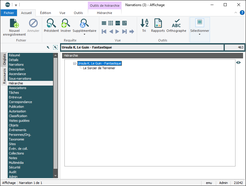 Un des avantages de cette approche est qu'il est possible de voir l'arbre entier comme structure des narrations dans l'onglet Hiérarchie pour tout enregistrement inclus dans la hiérarchie.