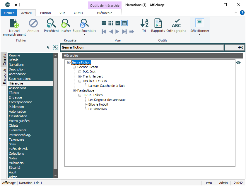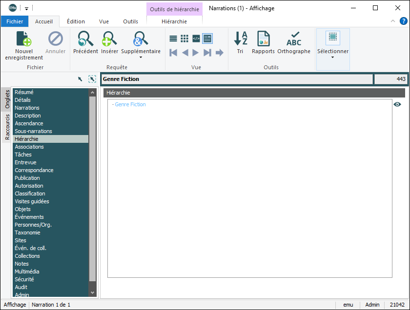 A ce stade et avant que nous établissions toutes relations entre nos narrations, l'onglet Hiérarchie pour l'enregistrement Genre Fiction apparaît comme cela :