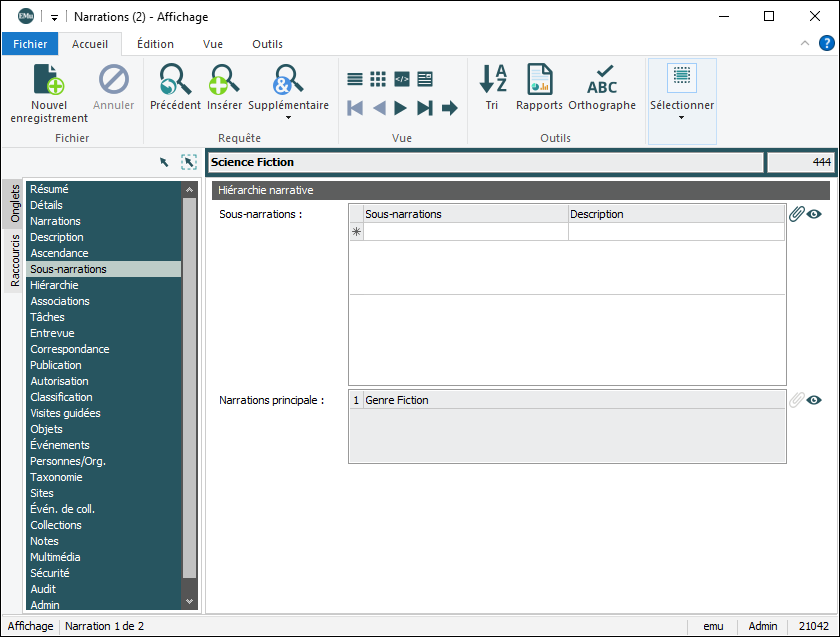 Et l'onglet Sous-narrations de l’enregistrement narration Science Fiction indique maintenant que la narration Genre Fiction est sa Narration principale :