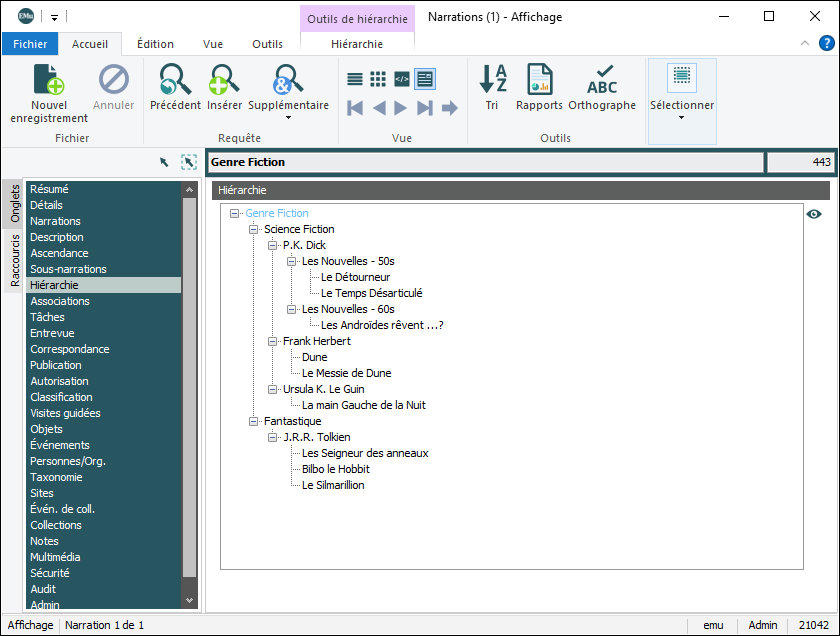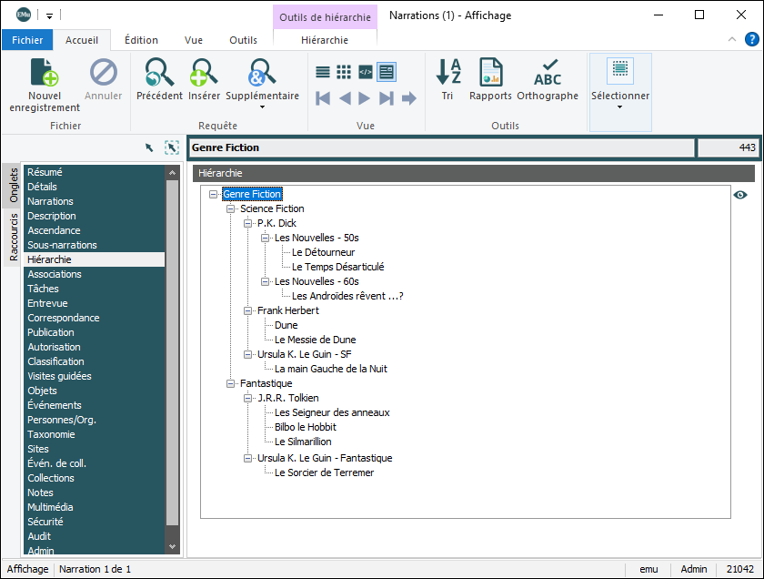 Note: Il existe plusieurs façons d'y parvenir, la plus simple étant de saisir les détails d'une sous-narration, par exemple Science Fiction, dans le champ Sous-narrations : (Hiérarchie narrative) et appuyez sur TAB. EMu effectue une recherche dans le module Narrations à partir des données saisies (voir Fichiers joints pour plus de détails).
