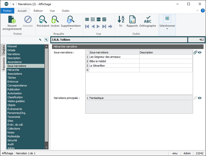 Si nous regardons l'onglet Sous-narrations pour la narration appelée J.R.R. Tolkien nous trouverons que la narration Fantastique est listée comme sa Narration Principale et trois narrations sont listées comme Sous Narrations :