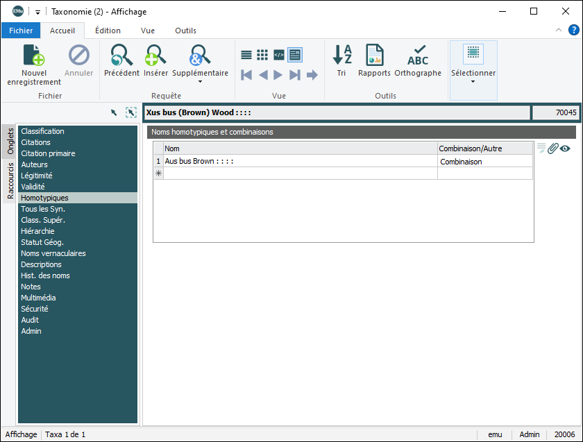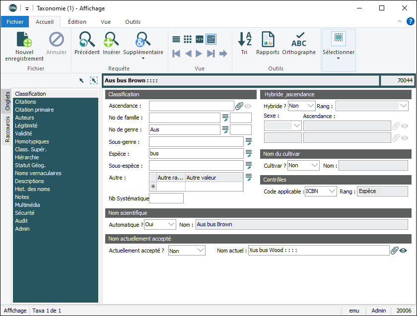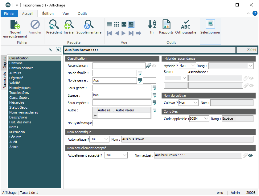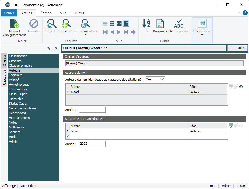 le nom entre parenthèses (Brown) est l'auteur d'un nom d'espèce original. Le nom entre parenthèses - l'auteur entre parenthèses - est utilisé lorsque l'épithète d'espèce dans un nom scientifique est combinée avec un genre différent. C'est une forme spécialisée de synonymisation.