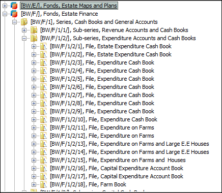 Chaque enregistrement a un champ Données sommaires. Données sommaires est une combinaison de données importantes dans un enregistrement (tiré d'un ou plusieurs champs). En Vue de Détails, le Données sommaires de l'enregistrement en cours s'affiche sous le ruban. Le Données sommaires de l'enregistrement cible apparaissent dans un champ fichier joint lorsque deux enregistrements sont joints. Le champ ou la combinaison de champs utilisés pour constituer les Données sommaires d'un module peuvent être spécifiés par chaque institution (et implémentés par les développeurs d'Axiell)., l’enregistrement en cours est [BW/E], Fonds, Estate, Maps and Plans. Dans la hiérarchie, nous nous sommes éloignés de l'enregistrement en cours et il n'est plus visible. Il est facile de revenir à l'enregistrement en cours en cliquant sur :