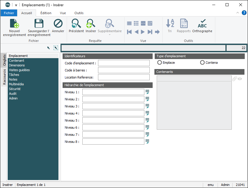 - Sélectionner le bouton radio Emplacement : (Type d'emplacement) ou Contenant : (Type d'emplacement).