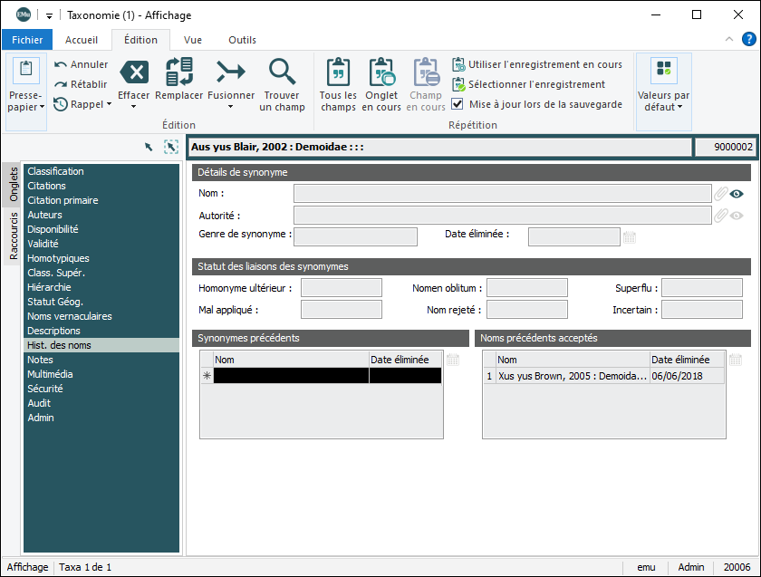 L'onglet Hist. des noms fournit une trace des changements dans la synonymie du nom. Par exemple, si Aus yus était un synonyme homotypique de Xus yus, puis devenait ensuite un nom accepté de plein droit, l'onglet Hist. des noms apparaîtrait ainsi :