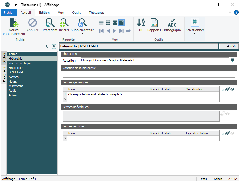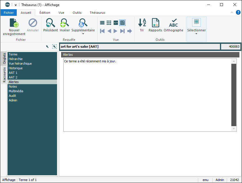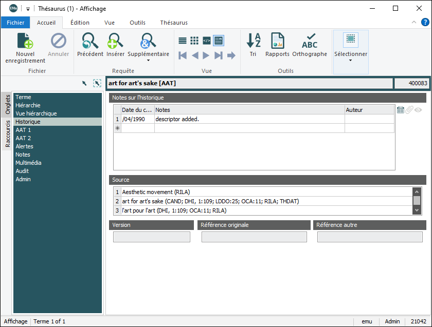 Il est possible d'importer un thésaurus commercial ou d'en développer un interne. Chaque thésaurus est identifié par un acronyme unique, par exemple AAT (Art Architecture Thésaurus ), LCSH (Library of Congress Subject Headings).