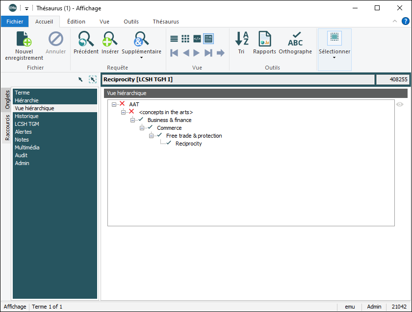 Le module Thésaurus stocke un ou plusieurs thesauri avec des listes de termes pouvant être utilisées pour ajouter des termes aux champs dans d'autres modules (lors de la description ou de la catégorisation d'objets). Un champ contrôlé par un Thésaurus peut être identifié par le bouton Thésaurus Thésaurus situé à côté. Un thésaurus peut être utilisé lors des recherches, des créations et des modifications d’enregistrements.