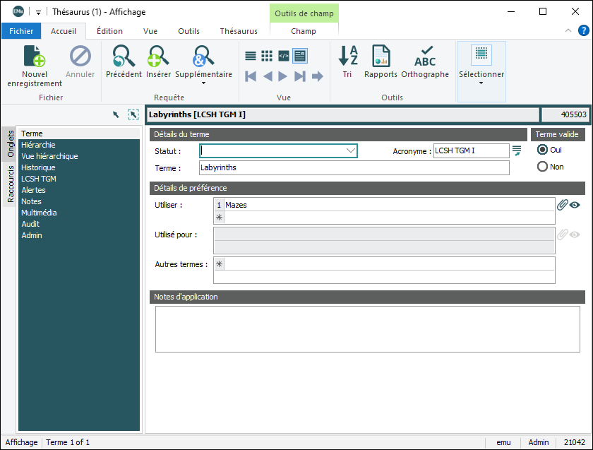 Les champs dans les autres modules peuvent être joints au Thésaurus et configurés de sorte que seuls les termes valides (tel que défini dans le thésaurus) soient acceptés dans le champ. Ceci assure une continuité dans les termes utilisés pour décrire les objets, et cela facilite les recherches.