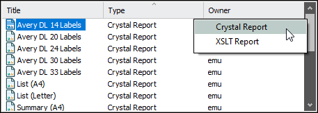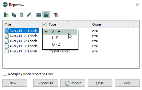 A Reports box includes a list of predefined reports. The list includes the report name, its Type and the name of the owner of the report (who created it).