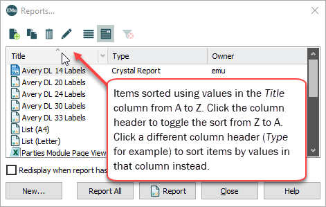 Items can be sorted on values in any column. Clicking the Owner header would sort items by the creator of reports in this example. The direction of the sort can be reversed by clicking a column header. In this example, clicking the Title header will reverse the sort and the arrow head will change to |