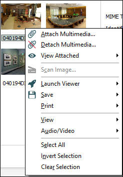 Alternatively, right-click a thumbnail in the Image pane for a context menu. As well as the Multimedia Toolbar options described above, several additional options are available from the context menu: