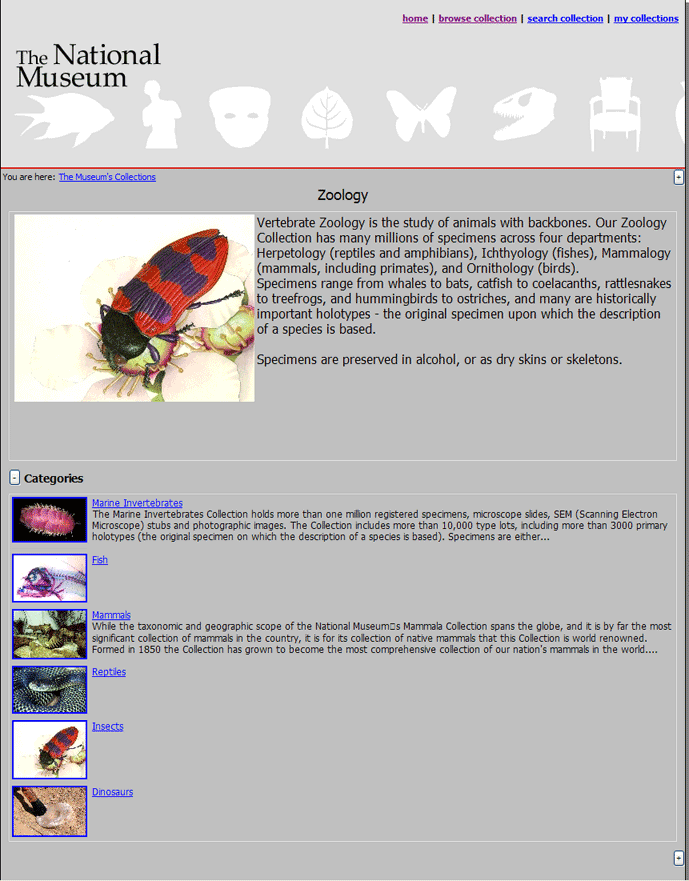 If we select the browse collection link (top right of the screen), our journey through the narratives begins and we are taken to a page that draws material from the unique Master narrative, The Museum's Collections: