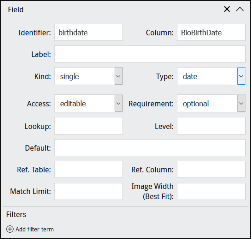 Note: Lorsque le nom back-end d'une table de valeurs est spécifié dans la colonne, Genre est automatiquement défini sur multiple. Dans l'exemple ci-dessus, NamOtherNames_tab est le nom back-end du champ Autres noms : (Détails personnels).