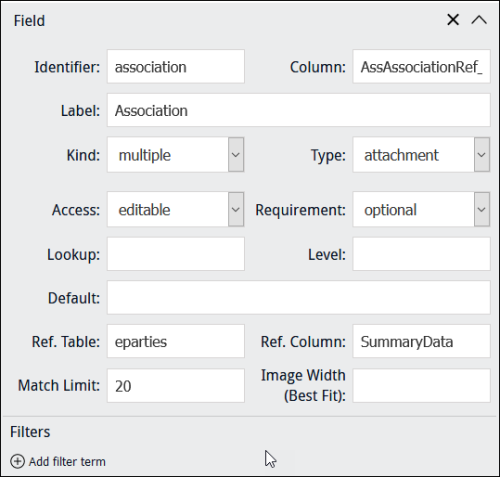 attachment. - Réf. Table est automatiquement définie comme le nom back-end de la table à laquelle se joint le champ de fichier joint spécifié dans la Colonne.