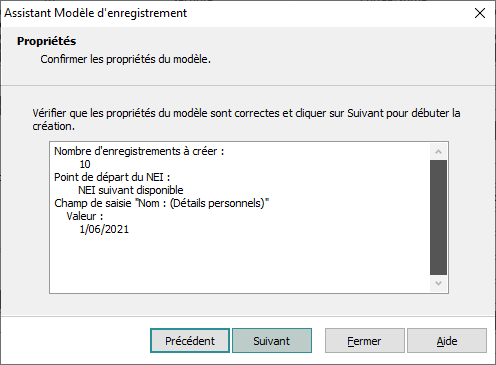 C'est un résumé du nombre d'enregistrements à créer, du numéro de départ du NEI et de toutes les valeurs d'entrée. Cliquer sur Précédent si nécessaire pour modifier des détails.