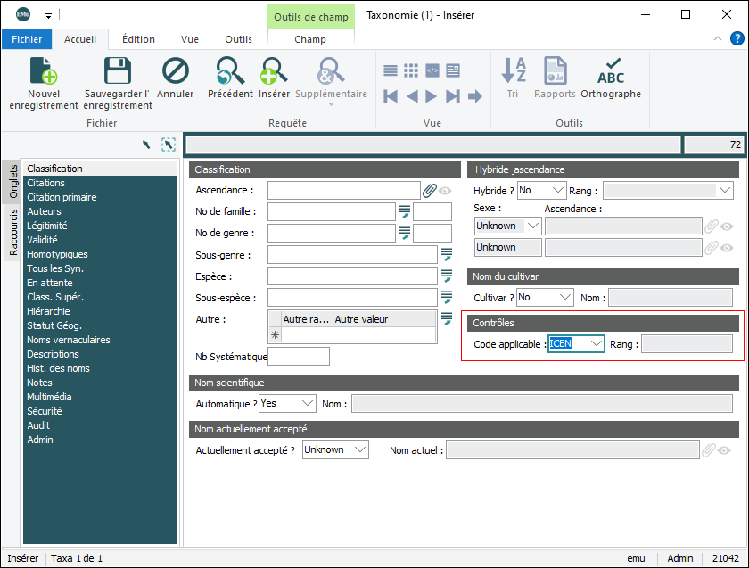Ces règles sont encodées dans EMu et il est simple de se conformer à l'une ou l'autre en sélectionnant ICBN ou ICZN dans la liste déroulante Code applicable : (Contrôles) de l'onglet Classification :